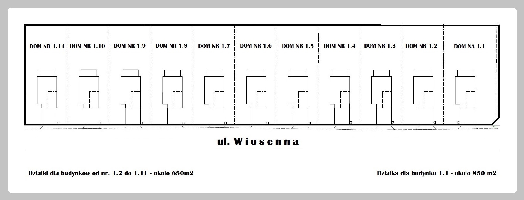 Powierzchnia działek dedykowanych dla poszczególnych budynków, to około 650m2 / 1 dom.